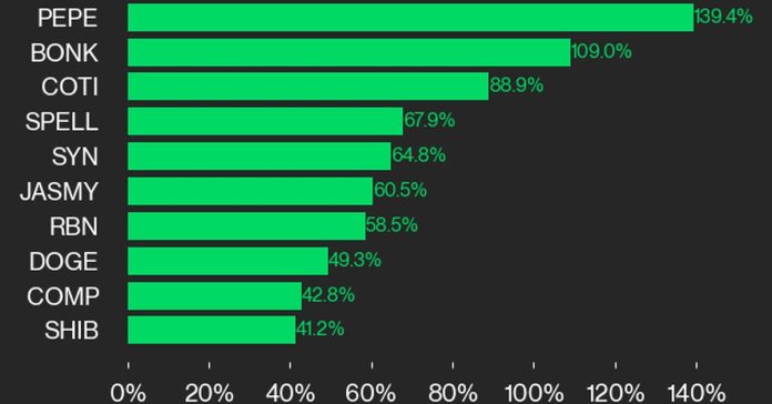 HomeCrypto NewsCoindeskMeme Coins DOGE and SHIB Led CoinDesk 20 Gainers Last Week: CoinDesk Indices ChartsMarch 1, 202400 CoindeskAll 20 of the CD20 assets were positive on the week, with fourteen posting returns greater than 10%. Source link TagsCoinDesk 20Previous articleFrom Low to High — Bitcoin Fees Jump Over 129% in 4 DaysNext articleftNFT International Awards 2024 Announces Winners at a Glamorous Ceremony in DubaiShareFacebookTwitterPinterestWhatsApp
