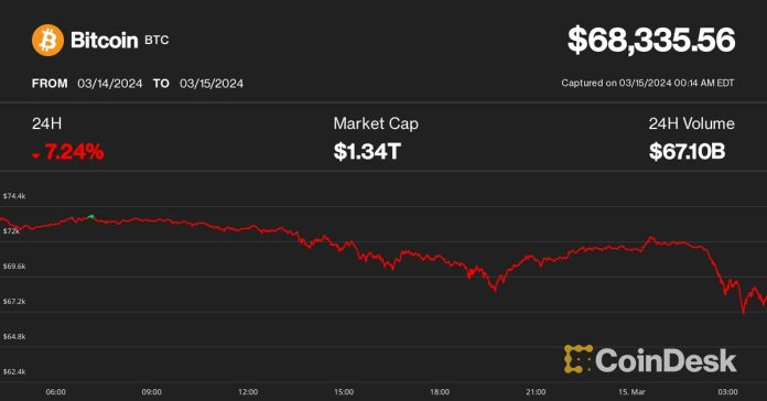 HomeCrypto NewsCoindeskBitcoin Tumbles to $67K As Asia Begins Trading DayMarch 15, 202400 CoindeskBitcoin’s price has begun a recovery, trading above $68,5K as the day continues. Source link Tagsbitcoin pricebtcPrevious articleAnalysts ‘Now More Convinced’ of Bitcoin Reaching $150,000 by Mid-2025Next articleSouth African Regulator Set to Issue Licenses to 60 Crypto Platforms by End of MarchShareFacebookTwitterPinterestWhatsApp