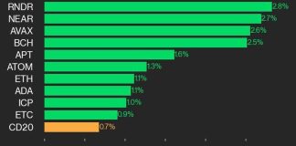 CoinDesk 20 Performance Update: RNDR and NEAR Lead Gains as Index...
